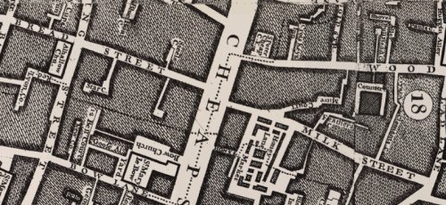 Both Bread Street and Milk Street, shown below on John Rocque's beautiful map of 1746, pre-date the Great Fire by hundreds of years. Milk Street is first recorded as early as 1140 and in 1302 the bakers of London were ordered not to sell bread from their houses but rather from the market in Bread Street.