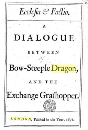 In the early 19th Century, one Skryme (see note 1), an apothecary known for sensationalist predictions of doom, took to broadcasting a prophesy that ‘when the grasshopper on the top of the Exchange shook hands with the dragon on the top of Bow Church steeple, fearful events would take place’. As luck would have it, in 1820 the same architect happened to be engaged in repairing both creatures and for a time both vanes lay ‘cheek by jowl’ as it were, in the same workshop. And sure enough, within a year Mr Skryme was able to report that: