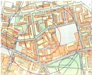 Turn left into St.George’s Lane. An unprepossessing view, lined with ugly office blocks, compares poorly with what one would have seen until 1904 when St.George’s was demolished.