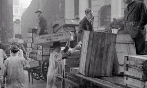 Billingsgate porters at work looking up St Mary-at-Hill