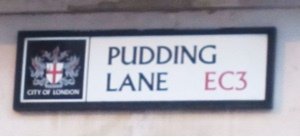As every schoolchild knows, Pudding Lane is where the Great Fire of London was started, shortly after midnight on Sunday, 2 September 1666. The exact site of the start of the fire is down at the bottom of the lane, and we’ll visit it later on in our walk. Our first destination, however, is the site of St George, Botolph Lane, one of the 15 or so Wren churches that have disappeared from London’s skyline. There is very little sign of St George’s now - not even a blue plaque - but if you look carefully as you walk down Pudding Lane to St.George’s Lane you should see an iron parish boundary marker set low down on a wall on the left hand side.