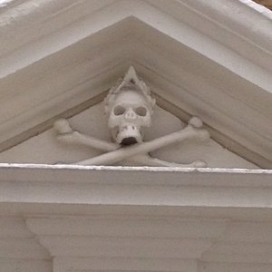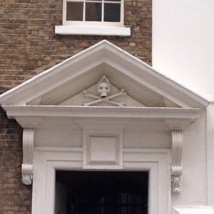 Skull & bones doorcase, St Mary-at-Hill